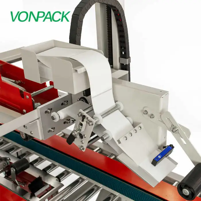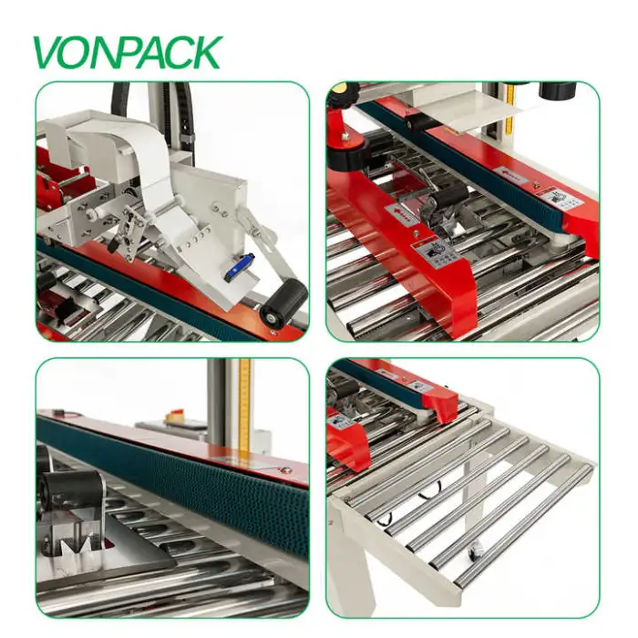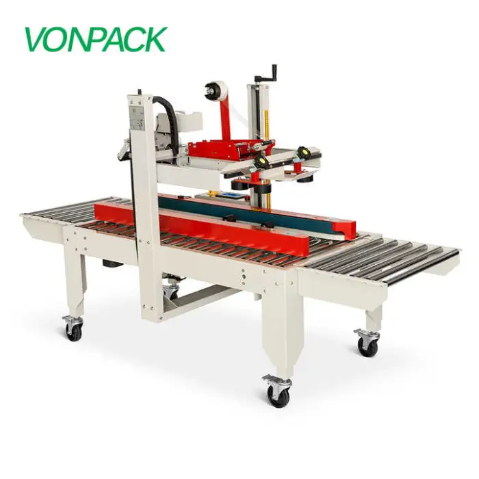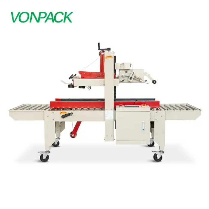 The specification summary lists 'paper' packaging material but does not detail tape type or widths. The machine generally supports standard carton sealing tapes; verify supported tape types and widths (e.g., pressure-sensitive, hot-melt, or water-activated) with the manufacturer.