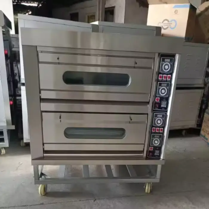 The oven has two decks with a total of four trays, allowing for maximum baking capacity.