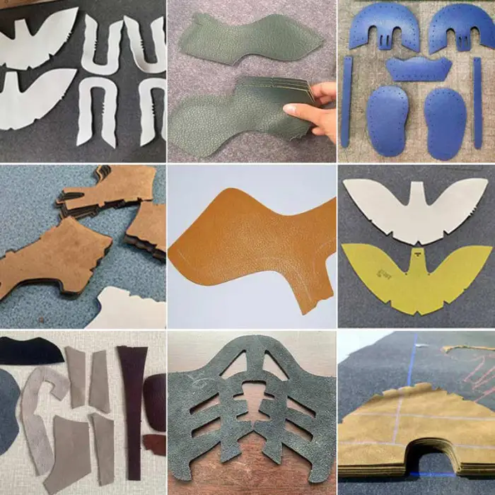 The machine is capable of cutting various materials including real leather, PU leather, fabric, paper, and PVC.