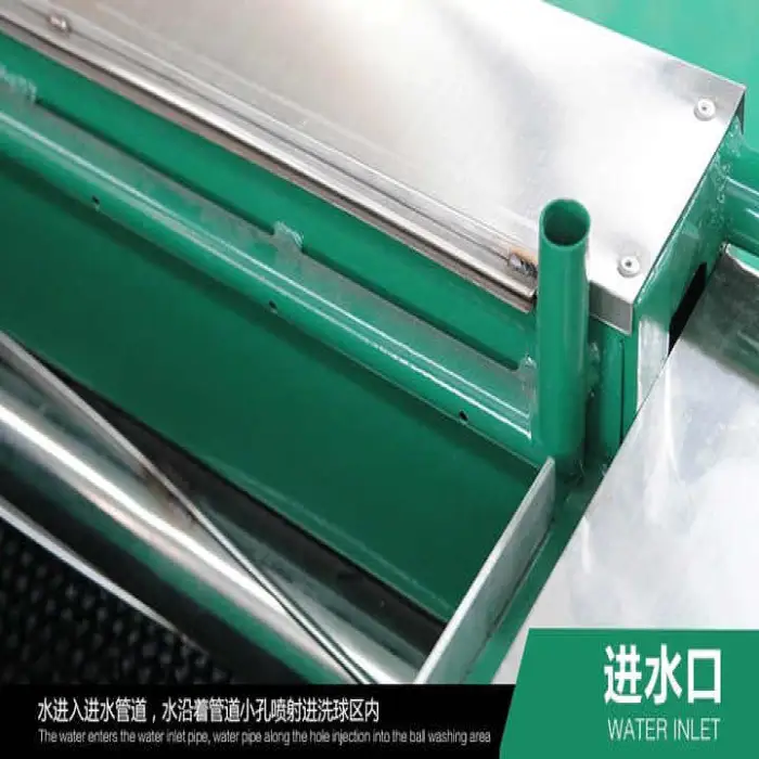 The unit washes automatically—balls are fed into the machine, cleaned with water and mechanical cleaning elements (brushes/rollers), and discharged ready for reuse. Operation is intended to be simple and user-friendly.