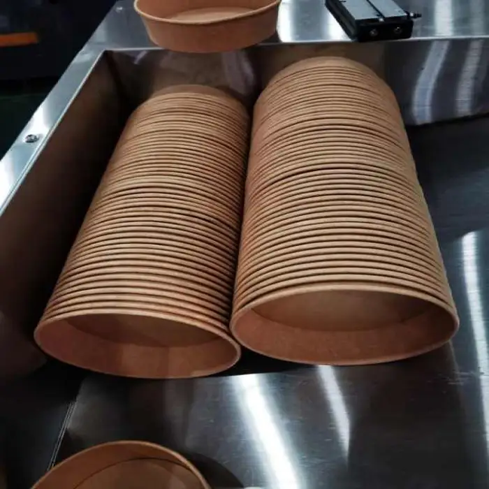 The machine supports bowl production for salads and take-away containers; mold changes or tooling adjustments are generally available to produce different sizes and shapes. Color customization is possible on the paper stock—discuss available options and tooling needs with the supplier.