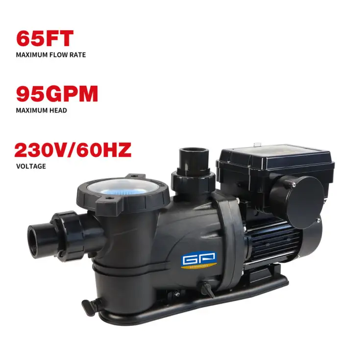 The GP Enterprises Swimming Pool Pump is available in two horsepower options: 1HP and 1.5HP.