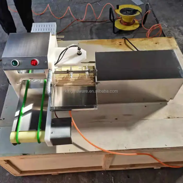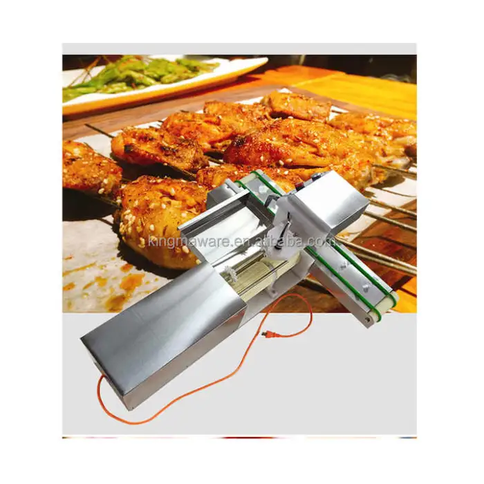 The machine has a production capacity of 1.5 to 2 skewers per second.