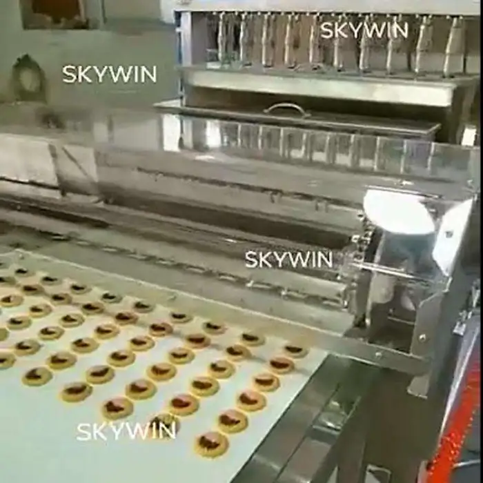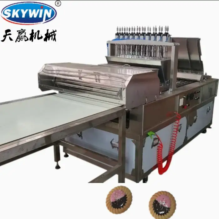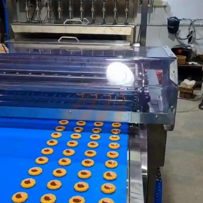 The machine can handle a variety of fillings including creams, jams, and chocolates, making it versatile for different biscuit types.
