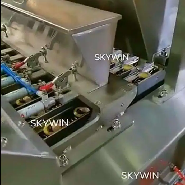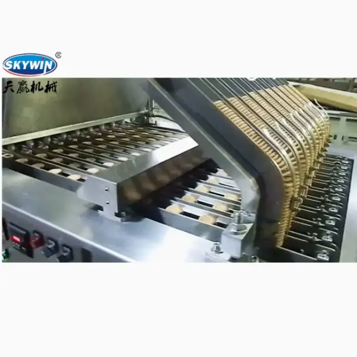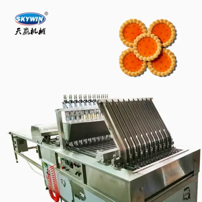 The machine is designed for high productivity, allowing for quick and precise filling of biscuits, which significantly speeds up the production process.