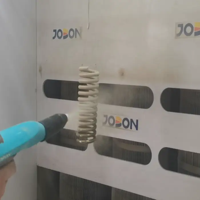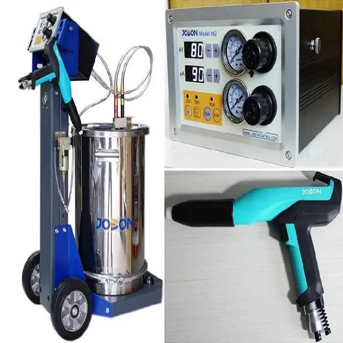 The machine is designed for electrostatic powder coating, making it suitable for various metal substrates, including steel furniture, automotive parts, metal tools, home appliances, and industrial equipment.