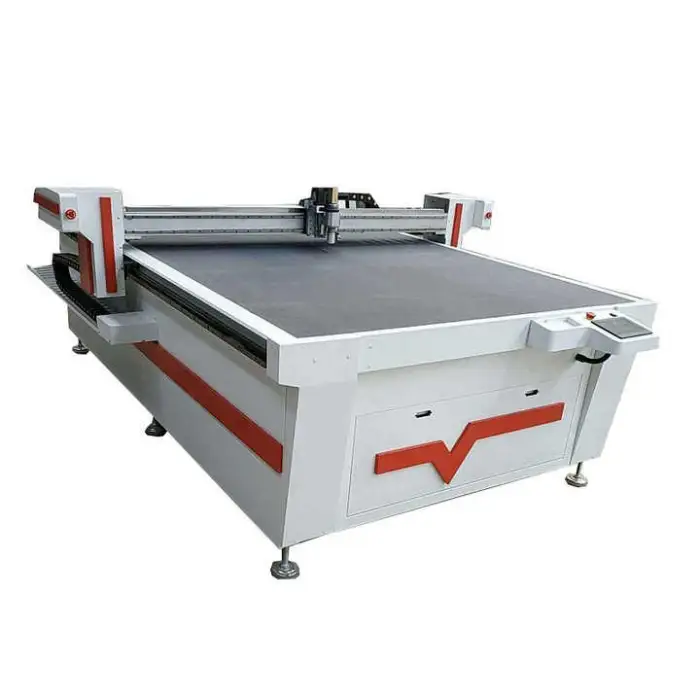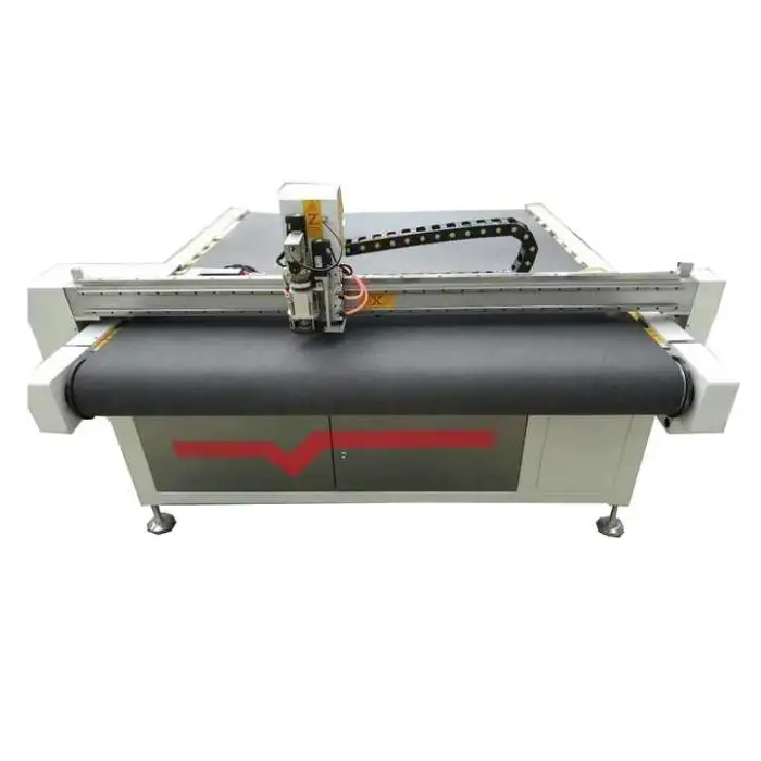 The machine can cut a variety of materials including fabric, leather, PVC, rubber, and corrugated paper.