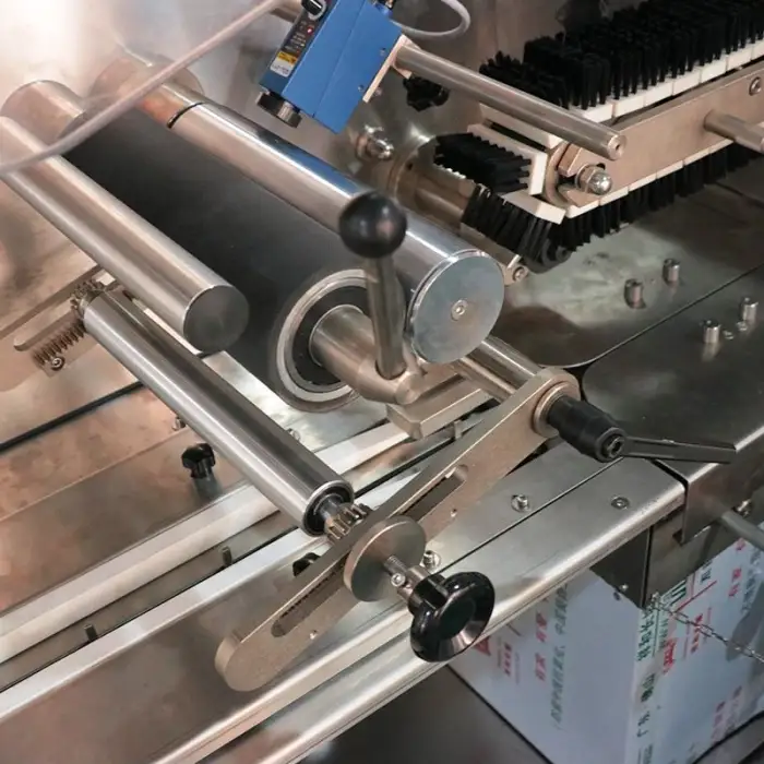 This machine is designed to package chocolate granola bars and is capable of handling various sizes of granola bars.