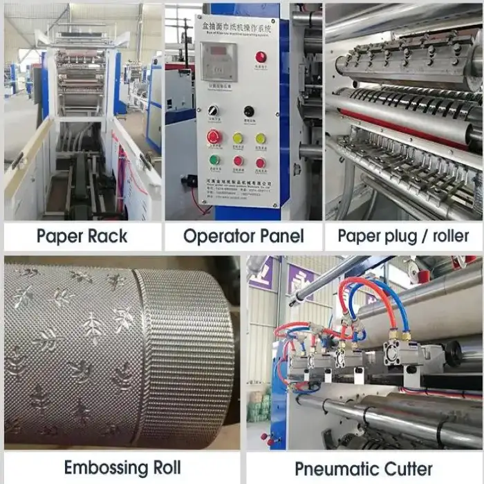 The machine can produce facial tissues with dimensions of 200mm x 200mm or other specified sizes.