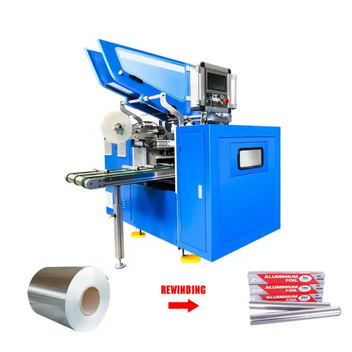 This machine is primarily used in packaging industries, particularly for rewinding aluminium foil. It is ideal for manufacturers focusing on high-speed production and quality control.