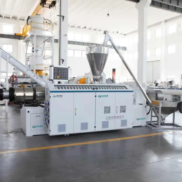 The machine can process PVC, wood-plastic composites (WPC), and wood-plastic materials.