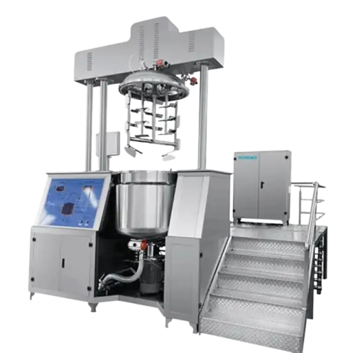 The homogenizer is controlled by a frequency inverter, allowing precise control over the emulsification process for better product consistency.