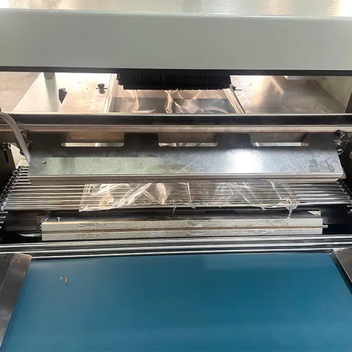 This machine is designed for packaging cheese bread, but it can also be used for food packaging, beverage packaging, chemical products, apparel and textiles, and cigarette packaging.