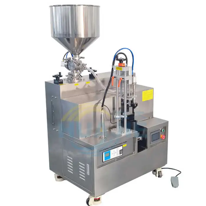 A semi-automatic ultrasonic tube sealer designed to create strong, consistent seals for tubes used in food, chemical and cosmetic industries. It combines electric and pneumatic drives with PLC controls for reliable small to medium-scale production.