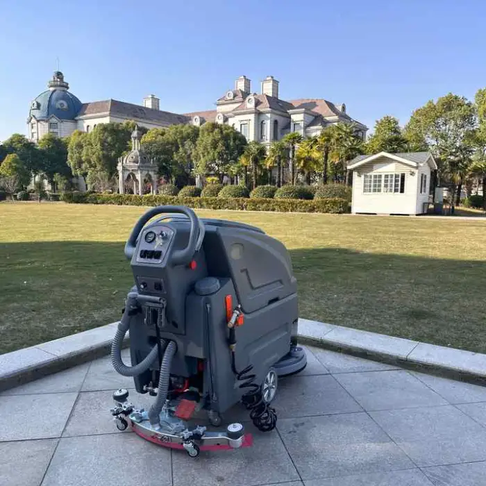 When operated per the user manual it is safe for commercial use. Recommended PPE includes non‑slip footwear and gloves when handling cleaning chemicals. Observe electrical safety, avoid using on excessively steep inclines, and follow lockout procedures for maintenance.