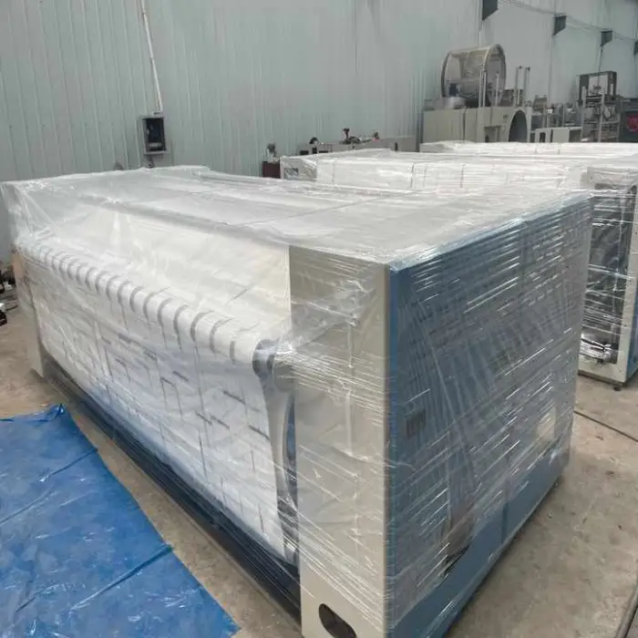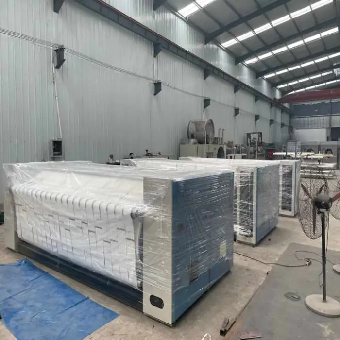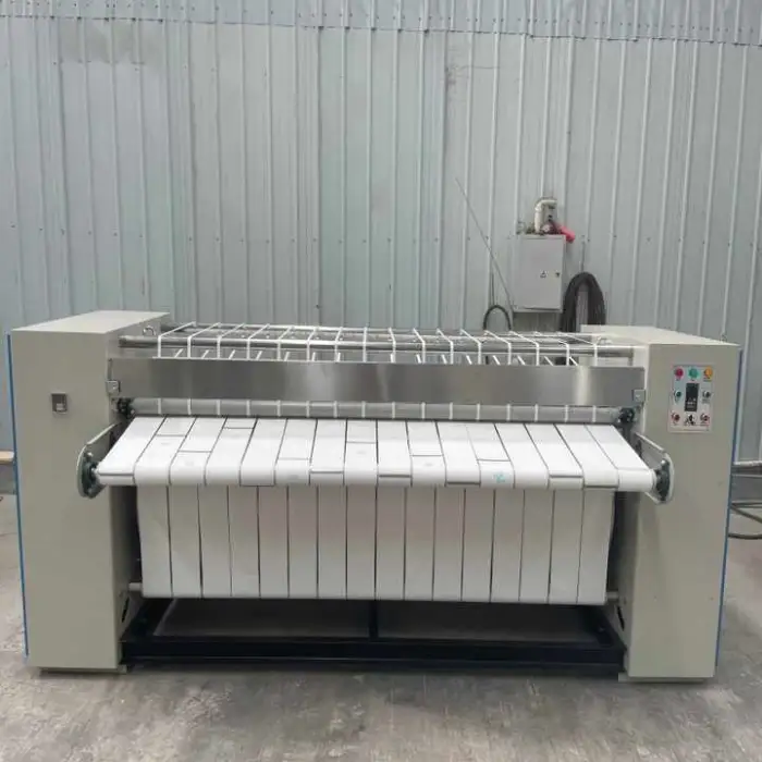 Commercial flatwork ironers generally include emergency stop buttons, protective guards around moving parts, temperature controls and overload protection. Verify the exact safety systems and compliance with local regulations before purchase.