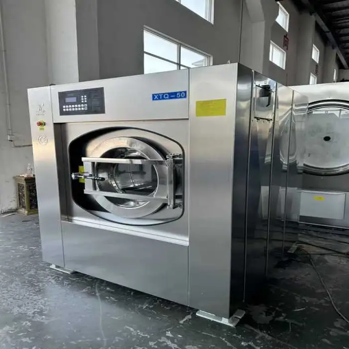 The washer is manufactured from 304 stainless steel, which is corrosion-resistant and suitable for the heavy-duty, frequent use demands of hospitals, hotels, and industrial laundries.