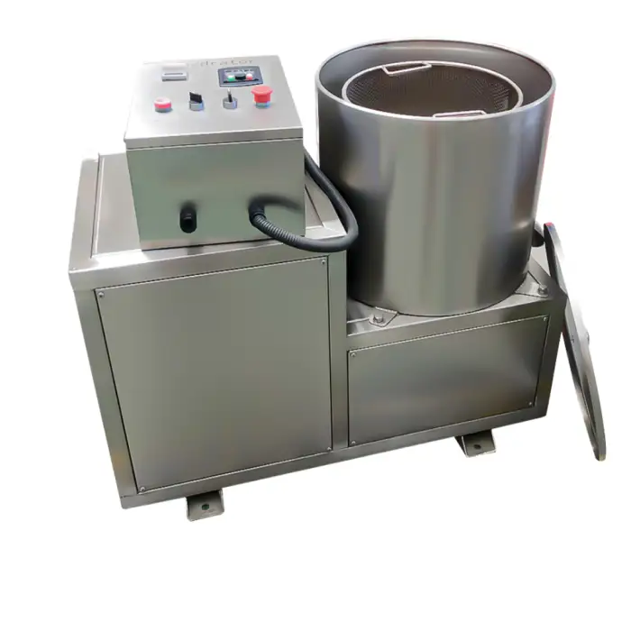 The machine removes excess moisture and oil from fried products (French fries, cassava chips, and other vegetables) to improve crispness and product quality in commercial food processing.