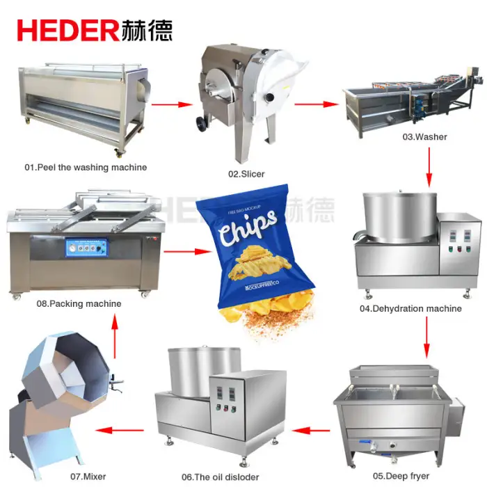 Applications include snack food production lines, commercial potato chip manufacturers, food processing industries, and snack food packaging facilities.