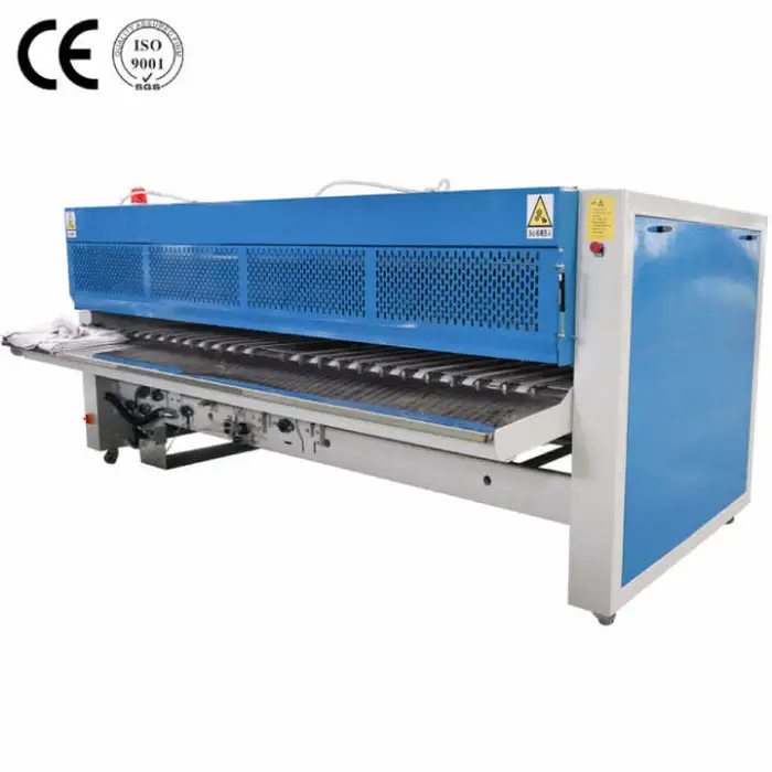 Yes — the machine uses PLC controls and can commonly be integrated with upstream washing/ironing conveyors and downstream packing lines. Integration requirements and interfaces should be discussed with the supplier so they can provide compatible control and mechanical connection options.