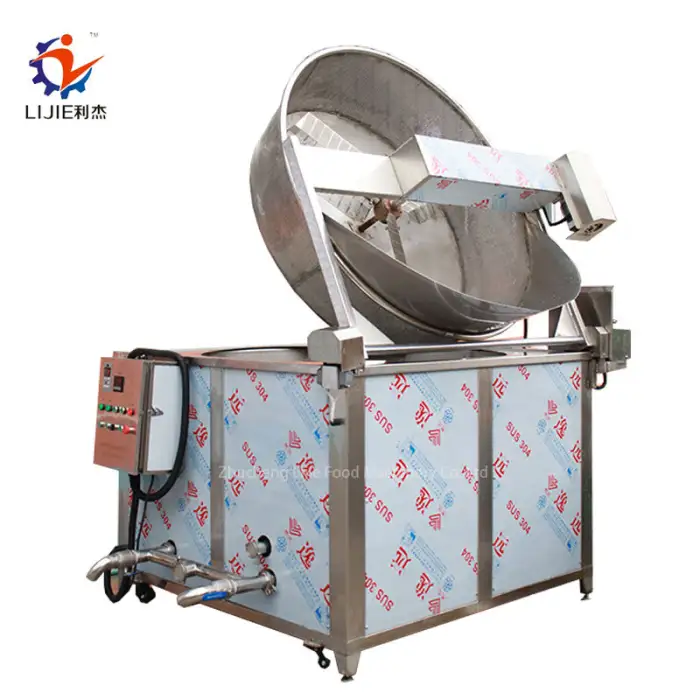 Key features include high productivity, durable stainless steel construction, easy operation, and an efficient continuous oil batch frying process.