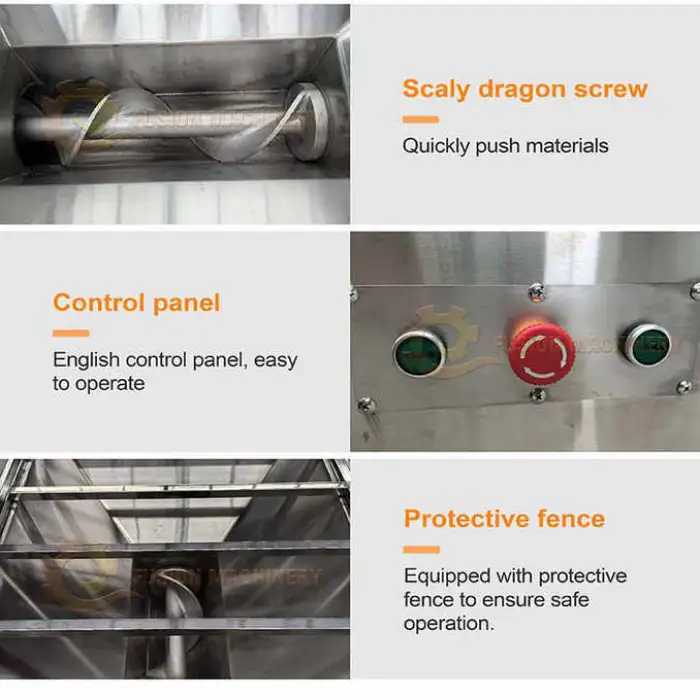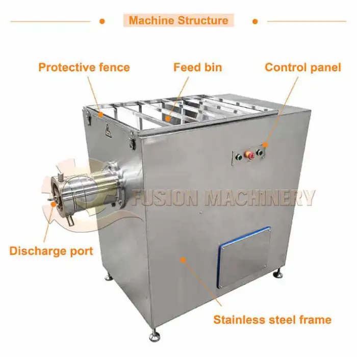 The rated production capacity is 500–1000 kg per hour; actual throughput depends on meat type, temperature (fresh vs. frozen), bone content and plate size.
