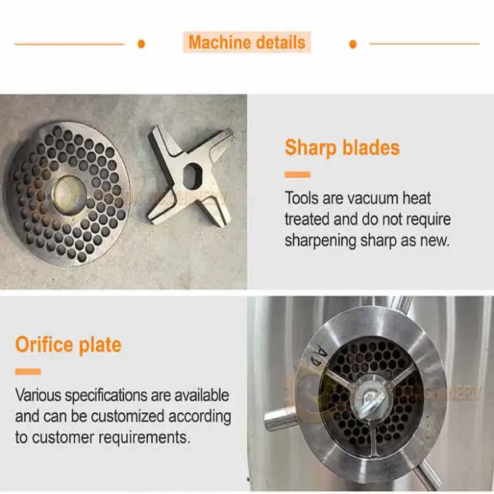 The description does not list accessories. Common options for industrial grinders include different hole-size plates, knife sets, feed hoppers and safety guards. Ask the supplier for available accessories and any customization for your production needs.