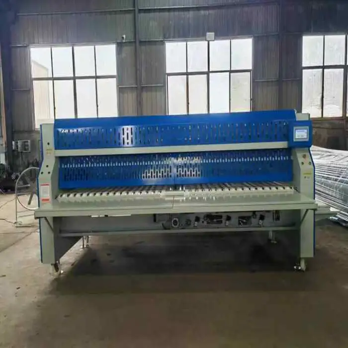 This is an industrial folding machine designed to fold bed sheets and large textiles automatically. It is an electrically powered, heavy-duty unit from Hedipower intended for commercial laundry operations such as hotels, hospitals, laundromats and textile manufacturers.