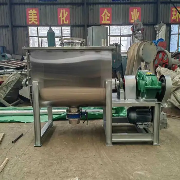 The mixer features a ribbon type design and operates at a spindle speed of 25 - 40 r.p.m. for effective mixing.