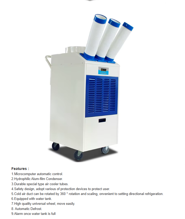This air conditioner is suitable for industrial settings, warehouses, temporary facilities, construction sites, event spaces, and manufacturing facilities.