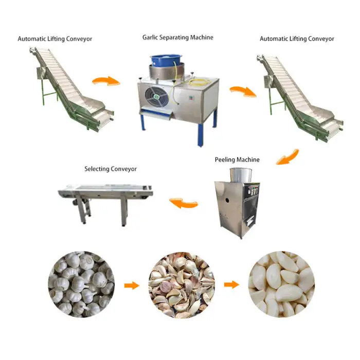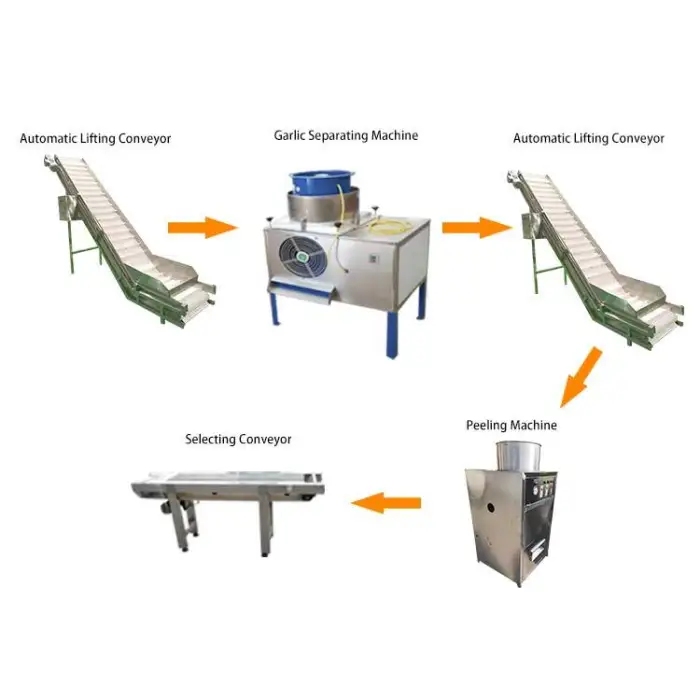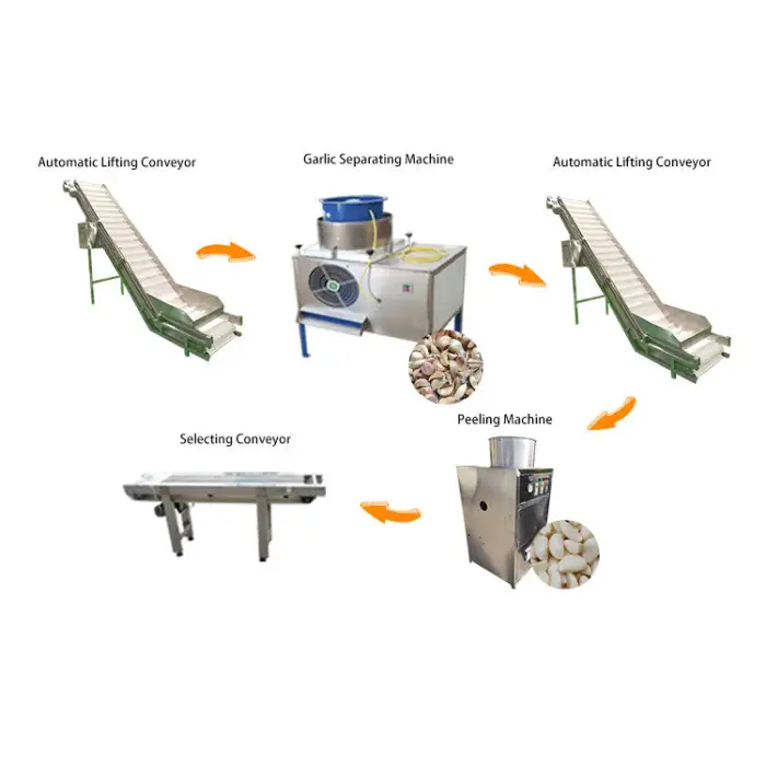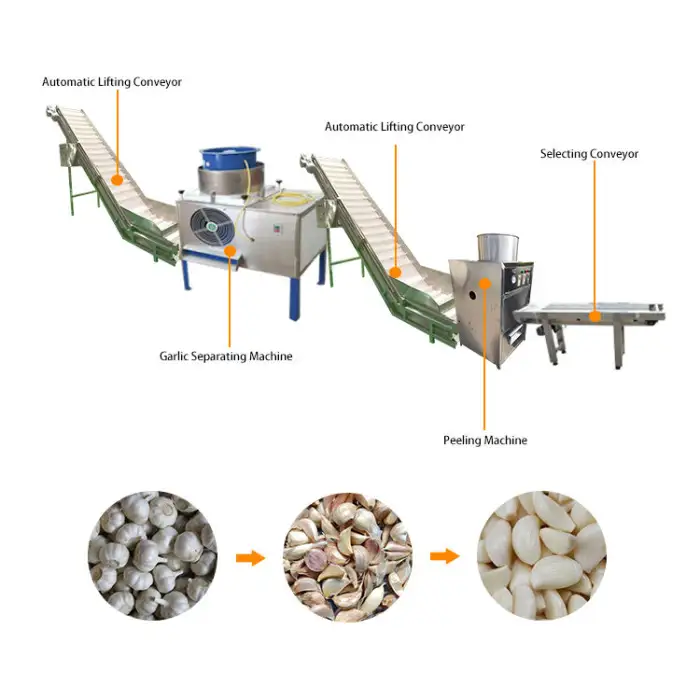 The primary function of this machine is to efficiently peel and pack garlic as part of a comprehensive garlic production line.