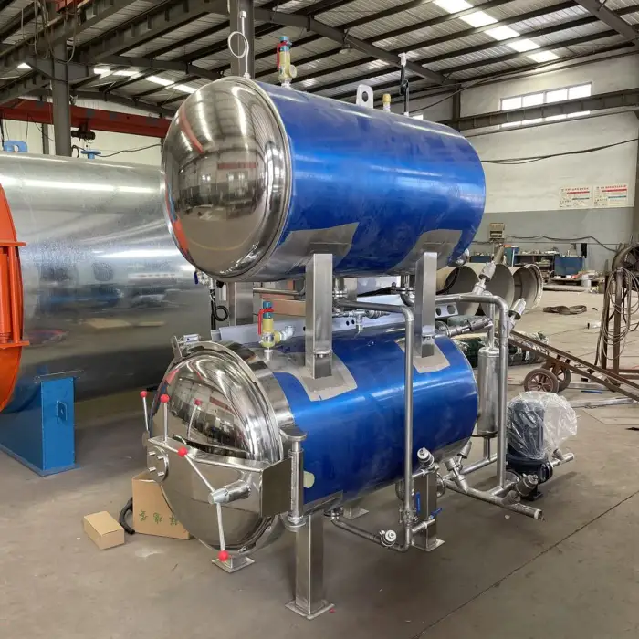 This autoclave uses a heat sterilization method, specifically applying steam and water spray to effectively sterilize food products.