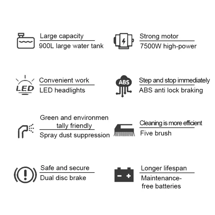 The water tank capacity is 900 liters, allowing for effective dust suppression during cleaning.