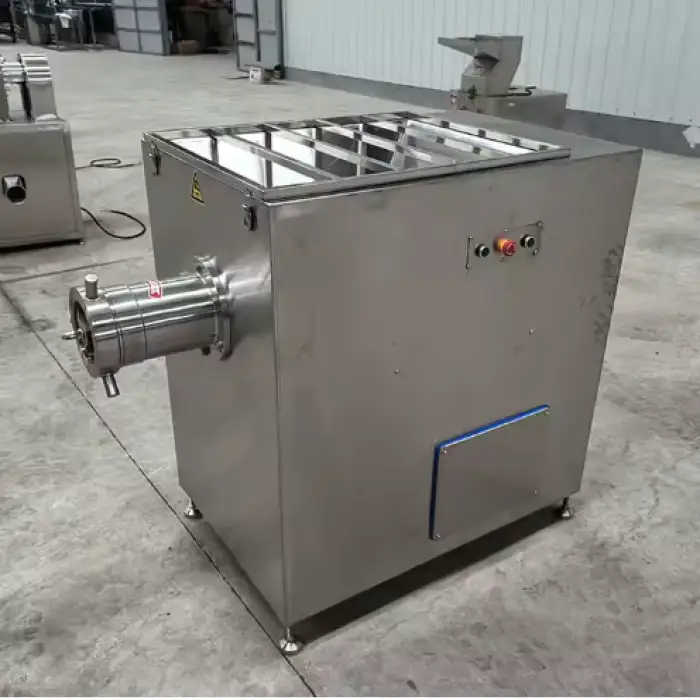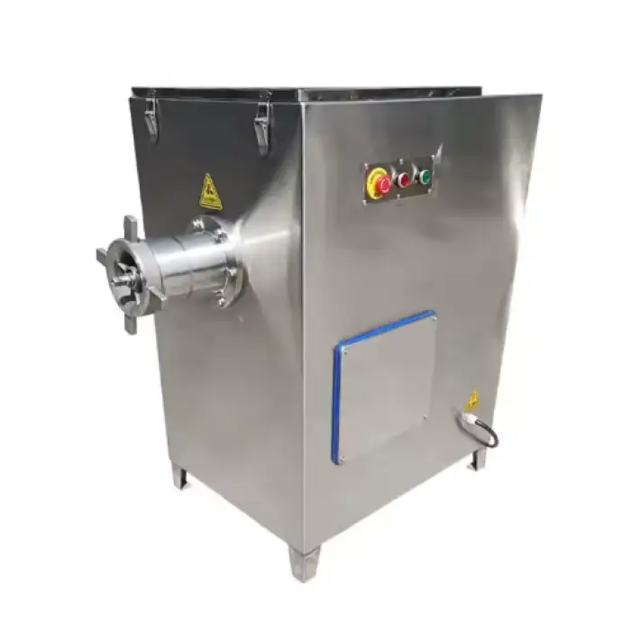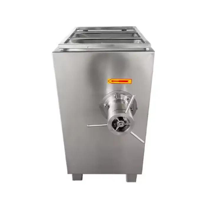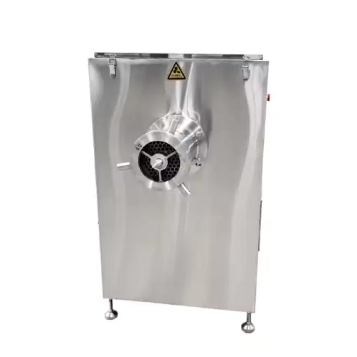 Industrial mincers typically include safety interlocks, emergency stop, and guarding on feed areas. Exact safety features can vary by configuration, so confirm the installed protections with the supplier before use.