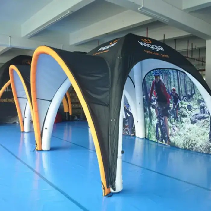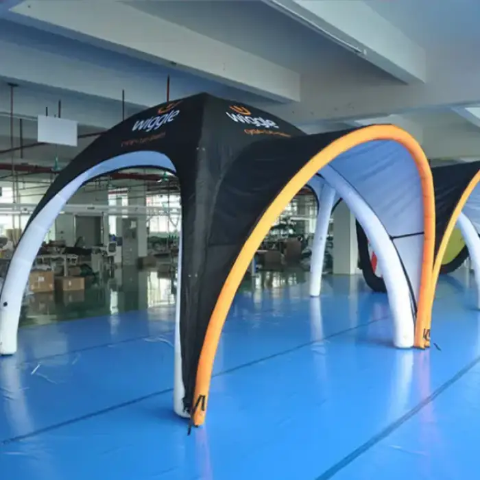 The Inflatable X Tent is crafted from high-quality TPU, Oxford, or PVC materials that are fire-resistant, waterproof, and lead-free, ensuring durability and safety.