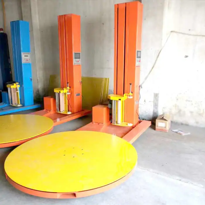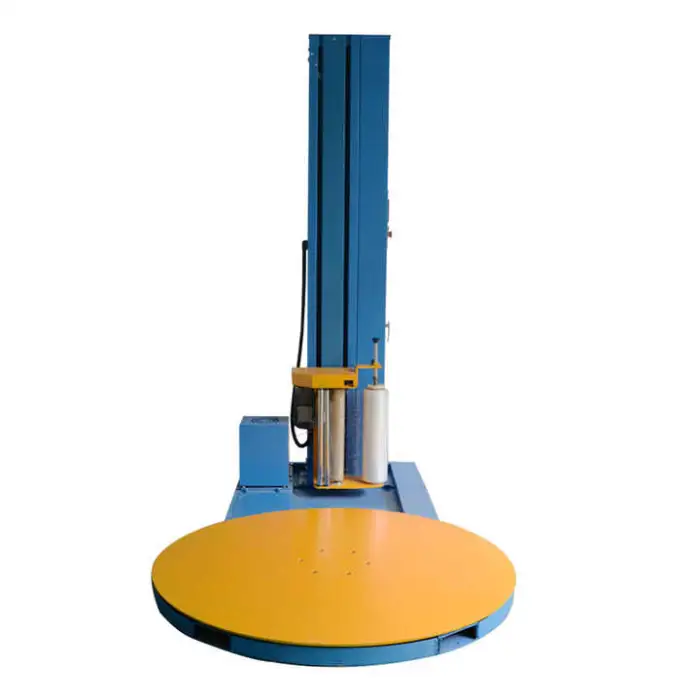 The machine uses stretch film as the packing material for wrapping pallets.
