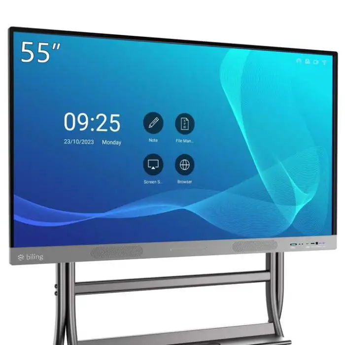 The unit is designed for floor-stand installation using the included mobile stand. Assembly typically involves mounting the display to the stand and connecting power/network. Follow the supplied user manual; professional installation is optional if you prefer assistance.