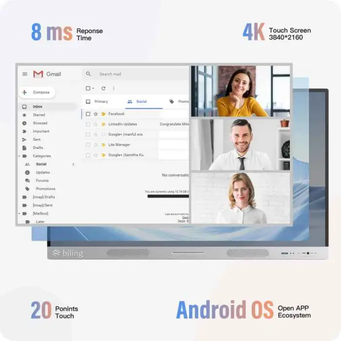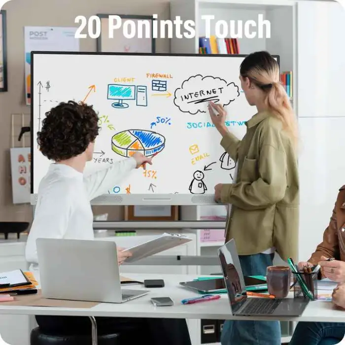 Yes — the panel is an interactive touch screen designed for writing, drawing, and presenting. It has a fast response time (listed as 8 milliseconds) for smooth input.