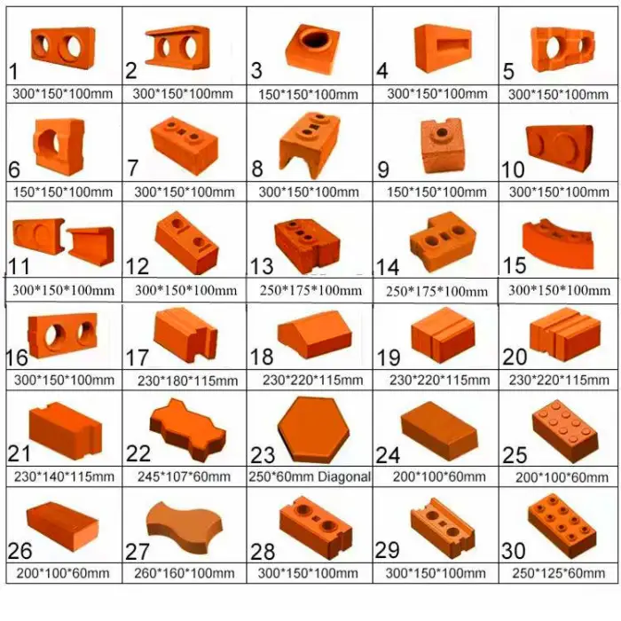 This machine can produce bricks in various sizes, including 400*100*200 mm, 400*120*200 mm, 200*100*60 mm, and several others.