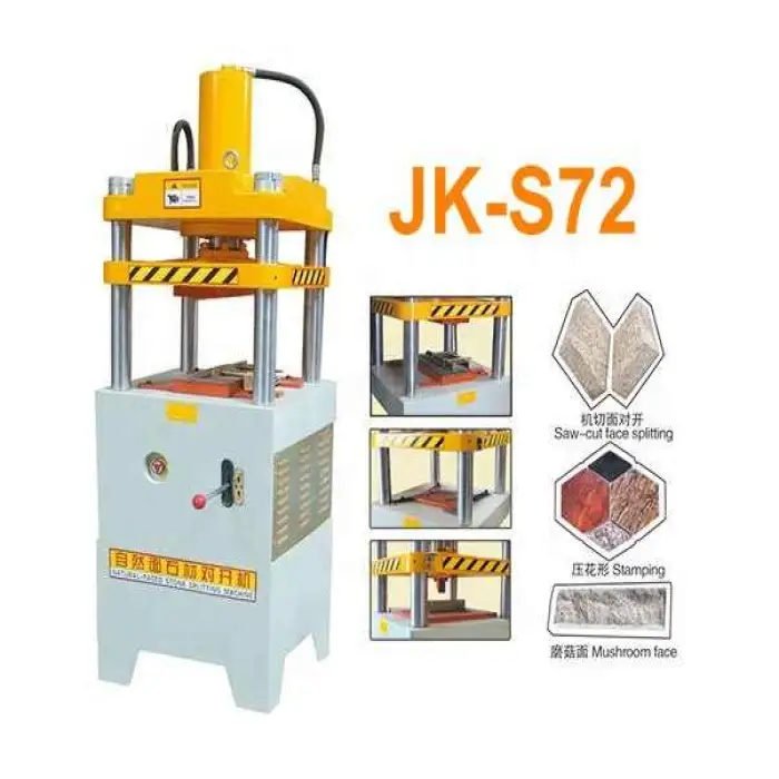 The JK-S72 Stone Mushroom Face Splitting and Pattern Stamping Cutting Machine can process various types of stones including granite, marble, sandstone, limestone, and culture stone.