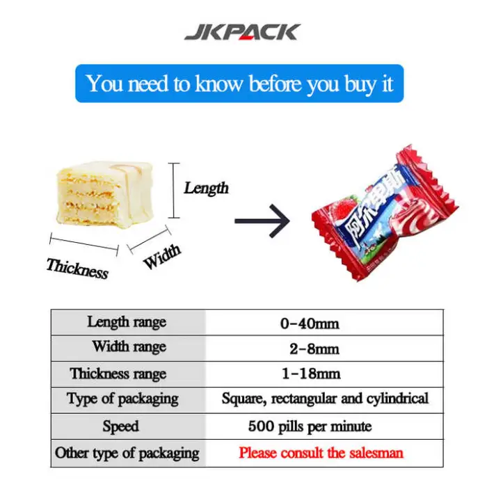 The JY-800Q/DXD-800Q Nougat Bonbon Flow Candy Packing Machine can pack various types of candies including toffee, soft candy, bubble gum, and nougat bonbons.