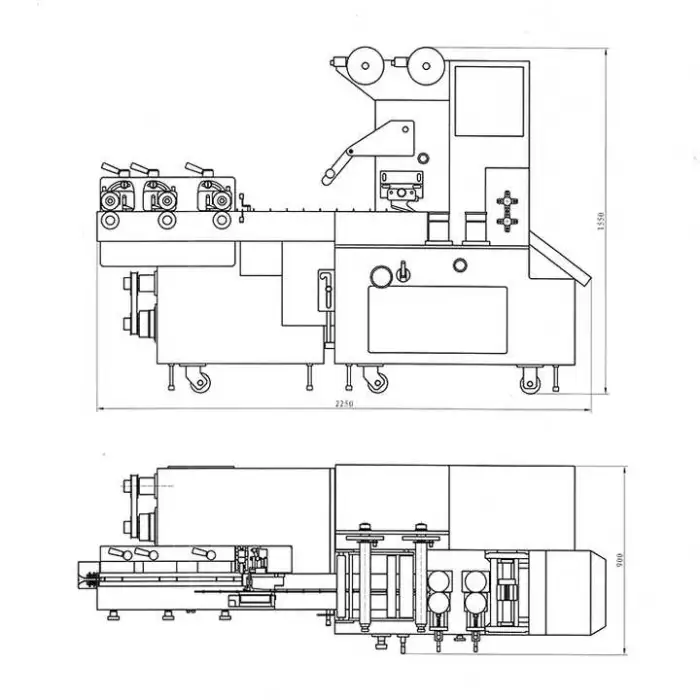 The dimensions of the machine are 2250mm in length, 900mm in width, and 1550mm in height.