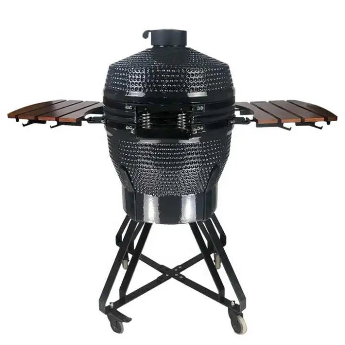 The grill is made from cast iron and ceramic, providing durability and excellent heat retention.