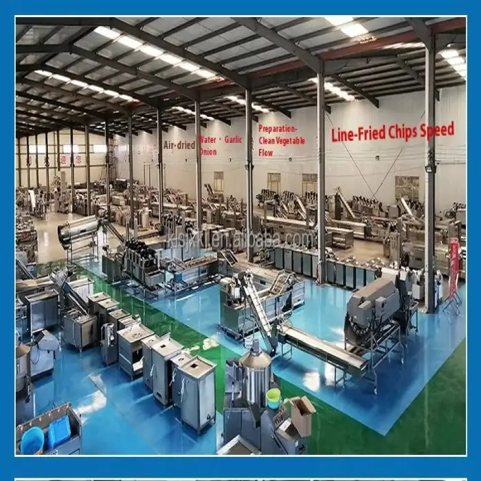 The production line includes key machines such as a fruit & vegetable peeling machine, fryer, and mixer.