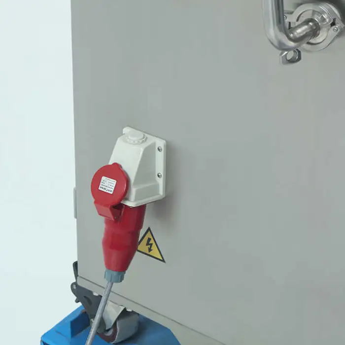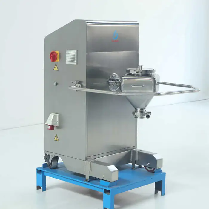 The automatic lifting mechanism raises and lowers the hopper for loading/unloading and process integration. It is controlled via the PLC for repeatable, hands-free operation.