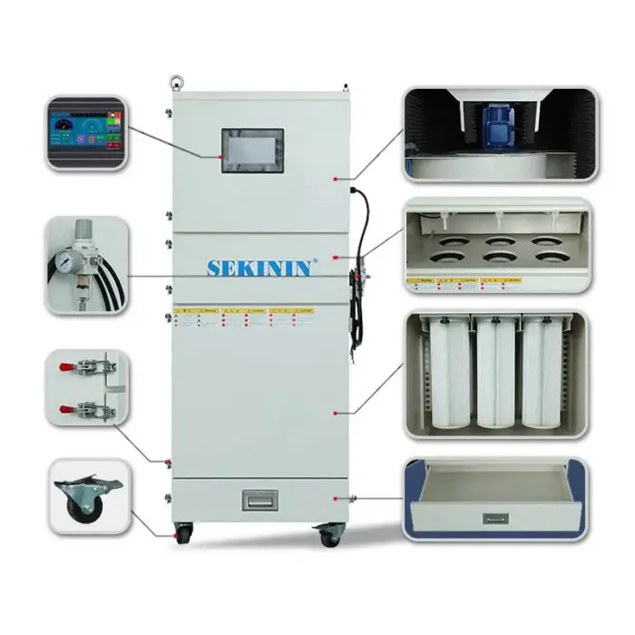 The pulse jet cleaning system uses bursts of compressed air to clean the filters, ensuring continuous performance and maintaining optimal dust collection efficiency.