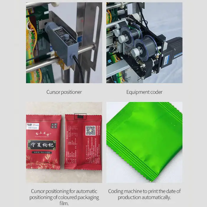 The machine can handle various materials including powders, granules, snacks, and herbs.