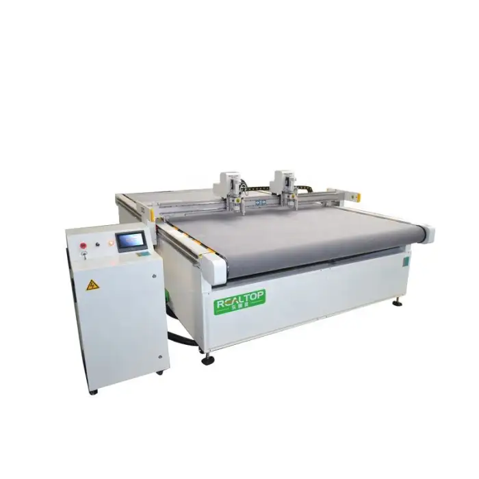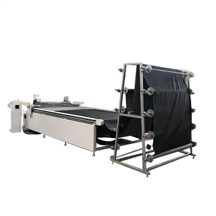 The machine is versatile and can cut various materials including denim, fabric, cloth, paper, leather, and more.