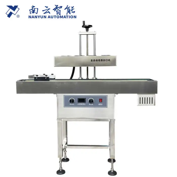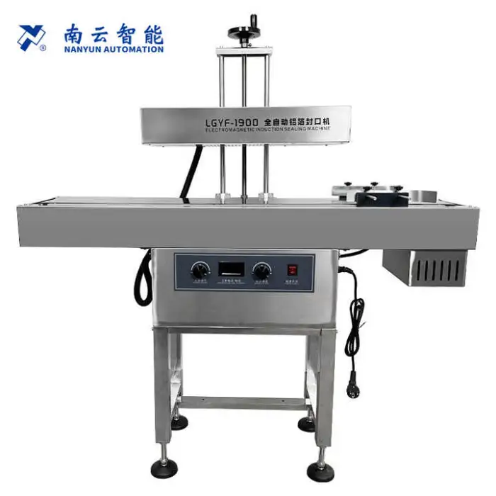 The LGYF-1900 is a fully automatic floor-standing electromagnetic induction sealing machine designed to apply aluminum foil seals to a wide range of containers (bottles, cans, jars, pouches, etc.) for food, beverage, chemical, cosmetic and industrial packaging.