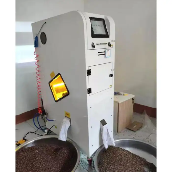 The sorter is designed to process various grains including rice, coffee beans, and peanuts.